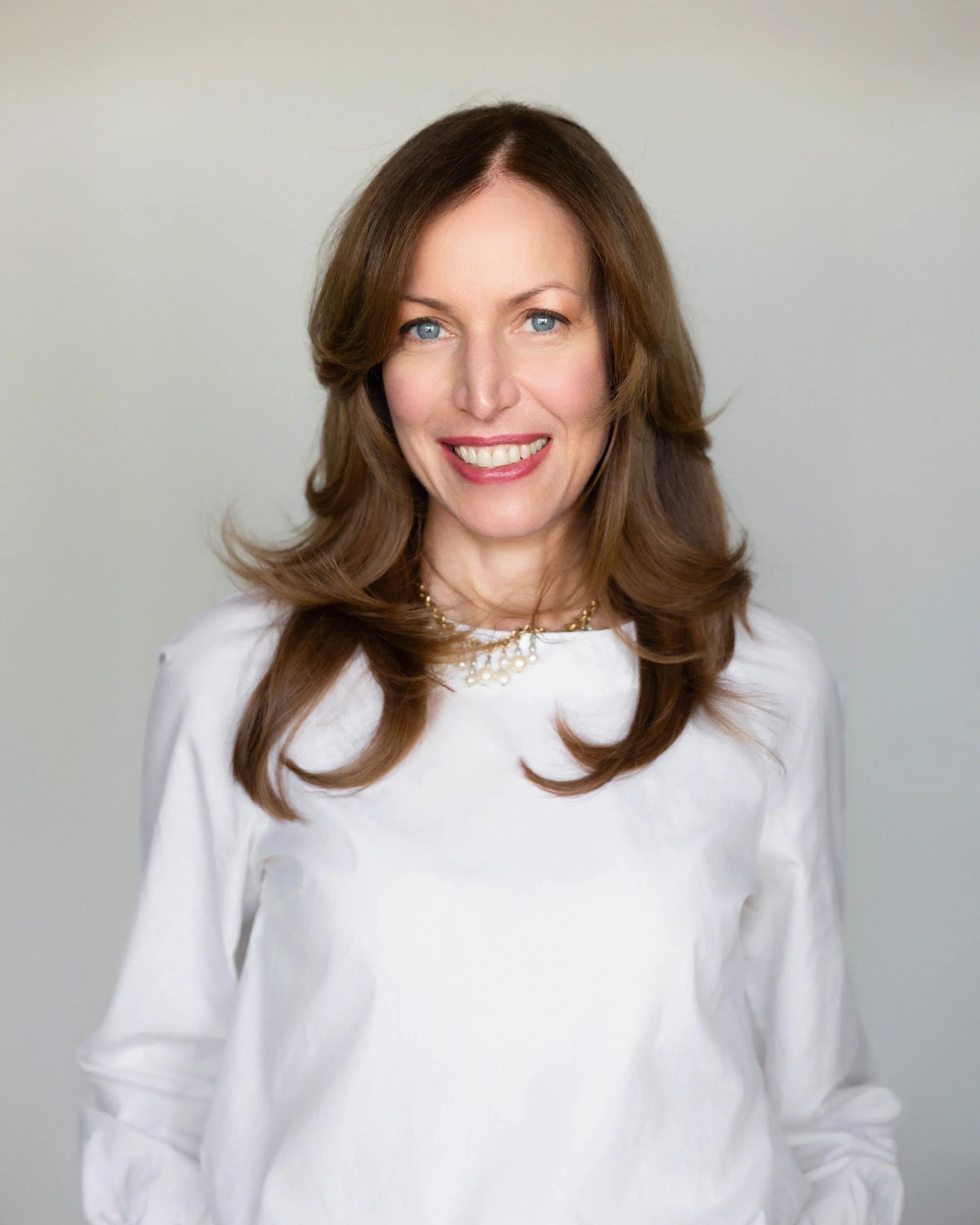 A woman with light skin, blue eyes, and long brown hair smiling, wearing a white blouse and gold necklace, standing against a plain light background.